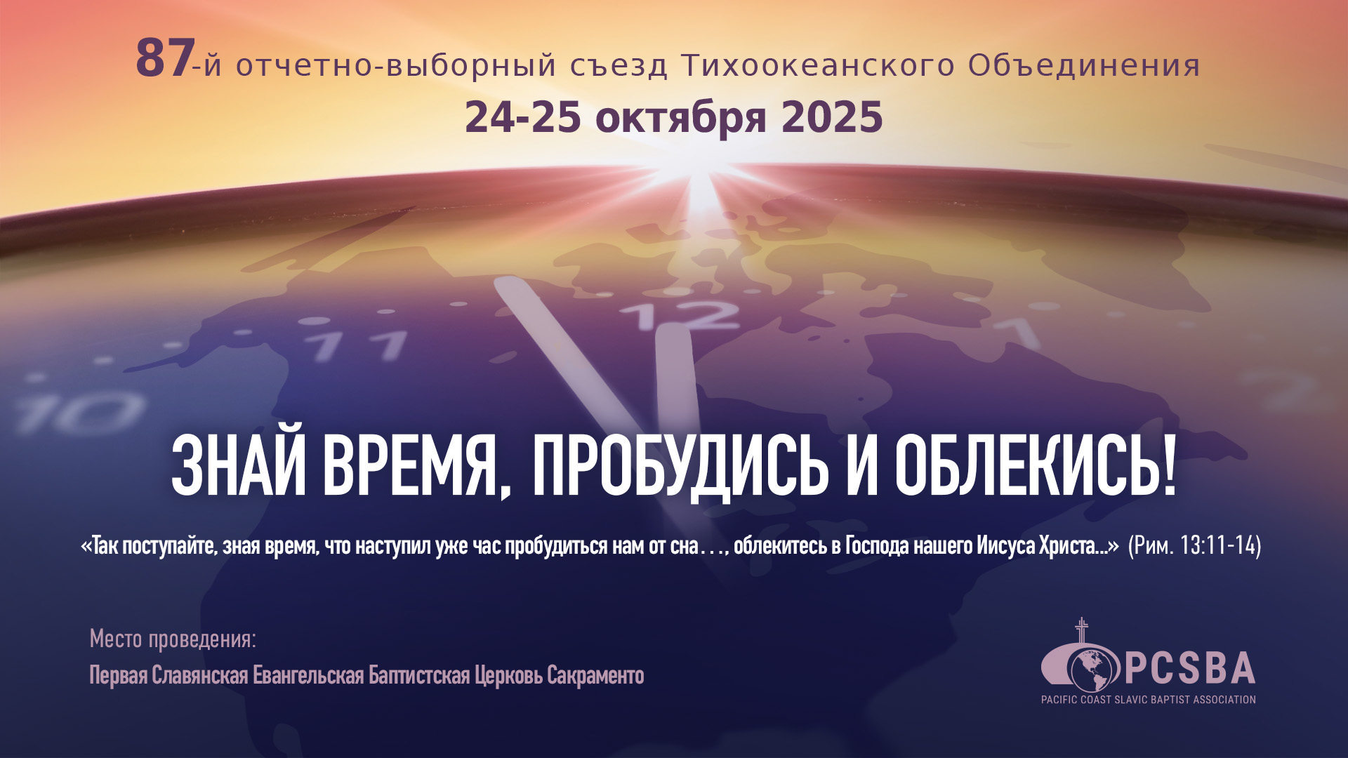 87-й духовно-назидательный съезд Объединения будет проходить 24 – 25 октября в помещении церкви Первой славянской баптистской церкви по адресу: 7238 Cromwell Way, Sacramento, Тема съезда: «Знай время, пробудись и облекись!» Текст: «Так [поступайте], зная время, что наступил уже час пробудиться нам от сна. Ибо ныне ближе к нам спасение, нежели когда мы уверовали. Ночь прошла, а день приблизился: итак, отвергнем дела тьмы и облечемся в оружия света. Как днем, будем вести себя благочинно, не [предаваясь] ни пированиям и пьянству, ни сладострастию и распутству, ни ссорам и зависти; но облекитесь в Господа нашего Иисуса Христа, и попечения о плоти не превращайте в похоти». (Рим. 13:11-14) Вечерами в пятницу 24 и 25 октября будут общие служения, открытые для участия всех желающих. Более подробно о программе смотрите раздел О съезде — Программа съезда. | РЕГИСТРАЦИЯ Регистрация делегатов церквей и гостей идет на основном вебсайте Объединения: - Регистрация на русской версии вебсайта